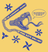 Just when you think Dave Hill's global street gang the Dangerous Snakes Who Hate Bullshit can't get any more extreme, along comes this shirt and it's just like forget about it. This shirt features an irritable talking snake (of course), a sweet set of nunchucks, and then a bunch of throwing stars to make for a design that will send most people running for their lives the second they see you in it. It's that awesome. It comes in two colors, yellow and light blue, which is amazing.